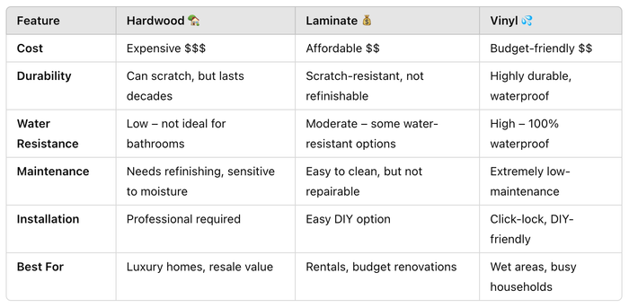 Among the most popular choices are laminate, hardwood, and vinyl. But which one is right for your home? Let's break it down by cost, durability, style, and maintenance so you can make the best choice!